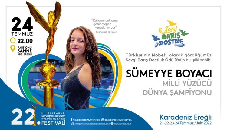 • Türkiye’nin Nobel’i olarak görülen Sevgi, Barış, Dostluk Ödülleri’nin bu yılki sahipleri; pandemi kahramanları, şiddet mağdurları tüm sağlık çalışanları adına TTB Merkez Konseyi Başkanı Prof.Dr. Şebnem Korur Fincancı ile Dünya Şampiyonu Milli Yüzücü Sümeyye Boyacı.