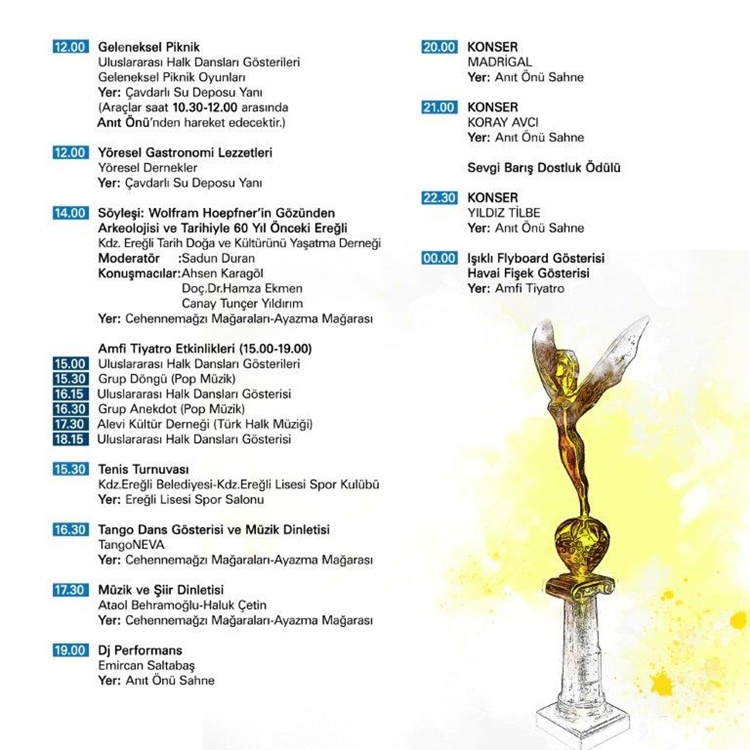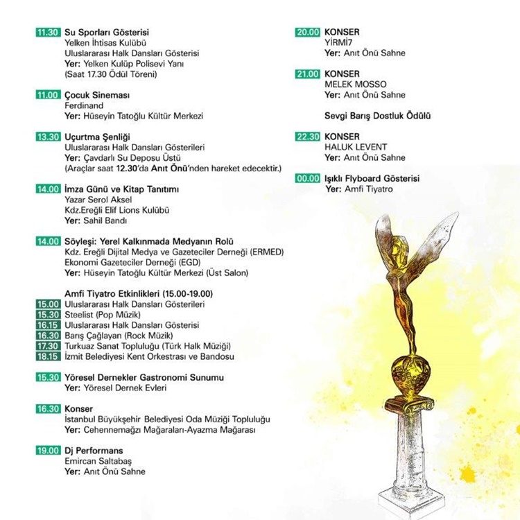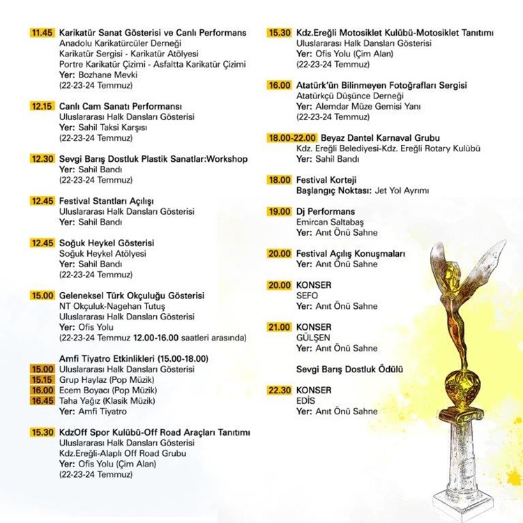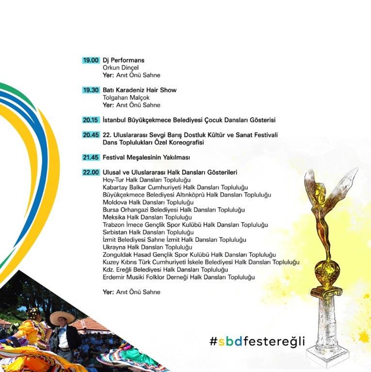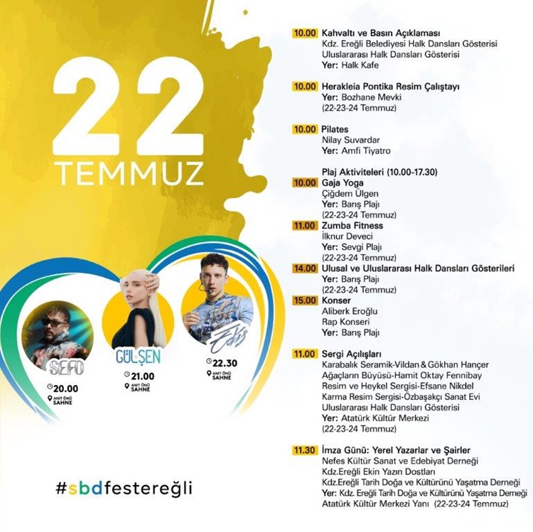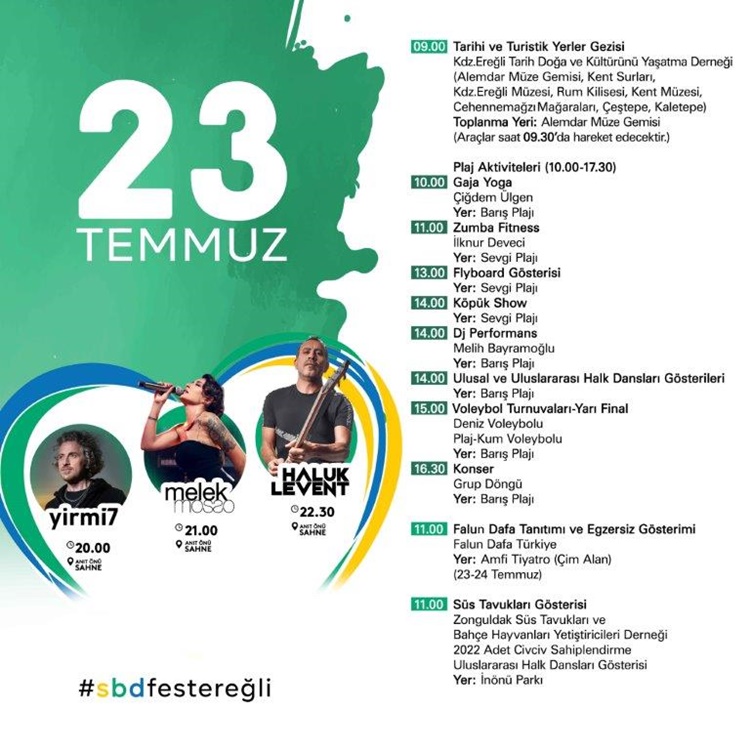• Kdz. Ereğli 22. Uluslar arası Sevgi, Barış, Dostluk Kültür ve Sanat Festivali 21-22-23-24 Temmuz’da… Gece konserlerinde, Sefo, Gülşen, Edis, Yirmi7, Melek Mosso, Haluk Levent, Madrigal, Koray Avcı ve Yıldız Tilbe  sahne alacak.