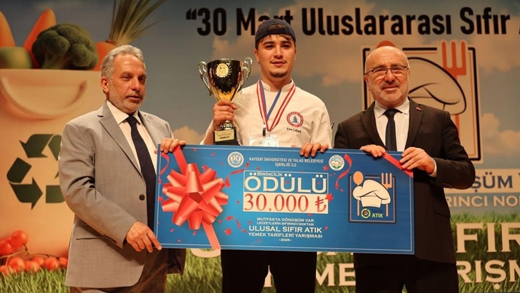 Kayseri Üniversitesi ve Talas Belediyesi iş birliğinde sıfır atık bilincini artırmak amacıyla düzenlenen, üniversiteler arası Gastronomi ve Mutfak Sanatları ile Aşçılık programlarını kapsayan yemek yarışması düzenlendi. Toplamda 14 üniversitenin Gastronomi ve Mutfak Sanatları Bölümü ile Aşçılık Programı öğrencilerinin katıldığı yemek yarışmasında, 9 öğrenci finale kalarak kıyasıya mücadele etti. Finale kalan tek ön lisans öğrencisi olma başarısını gösteren Eren Çakmak; sergilediği özgün yaklaşım ve sürdürülebilir mutfak vizyonuyla jüriyi etkiledi. Çakmak, şampiyonluk kürsüsüne adını yazdırarak, 30 bin TL’nin ve kupanın sahibi olup ödülünü Kayseri Üniversitesi Rektörü Prof. Dr. Kurtuluş Karamustafa ile Talas Belediye Başkanı Mustafa Yalçın’ın elinden aldı.
