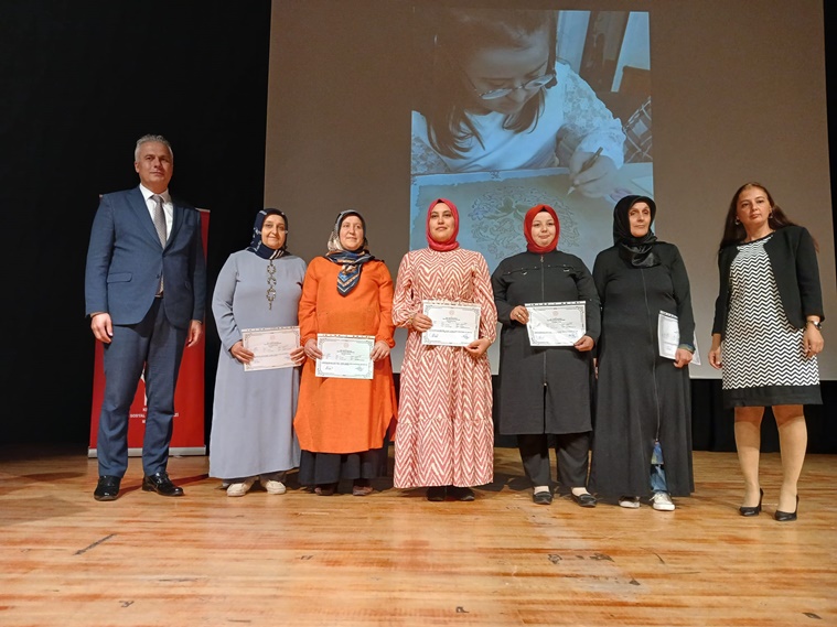 Halk Eğitim Merkezi’nde mesleki kurslara ağırlık verdiklerini aktaran Bozkurt, “ADEM ve SODAM projeleri kapsamında açılan bu kurslarımızda da kursiyerlerimiz mesleki kurslara yönlendirilmiştir. Aşçı yardımcılığından fön çekimine, gazaltı kaynakçılığından teknik resime, keten dokumadan çeyiz ürünleri hazırlamaya ve ahşap yakmaya bir çok kursumuzda başarı olarak belge alan kursiyerlerimizi kutluyor başarılarının devamın diliyorum.” ifadelerine yer verdi.