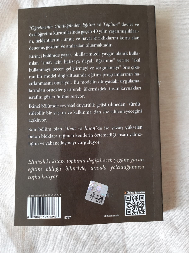 “Öğretmenin Günlüğünden Eğitim ve Toplum” devlet ve özel öğretim kurumlarında geçen 40 yılın yaşanmışlıklarını, beklentilerini, umut ve hayal kırıklıklarını konu alan deneme, gözlem ve anılardan oluşmaktadır.