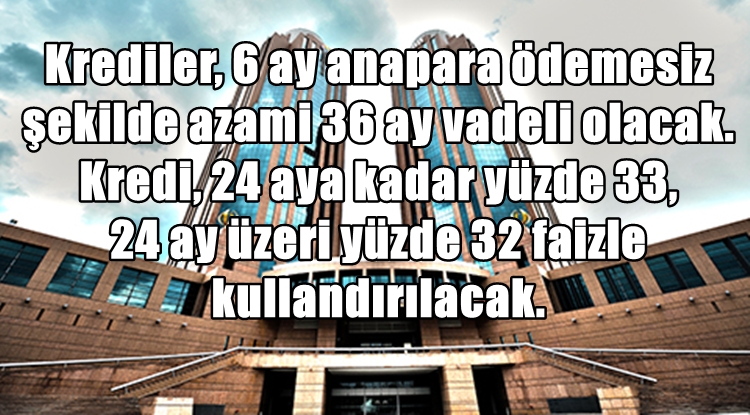 Krediler, 6 ay anapara ödemesiz şekilde azami 36 ay vadeli olacak. Kredi, 24 aya kadar yüzde 33, 24 ay üzeri yüzde 32 faizle kullandırılacak.