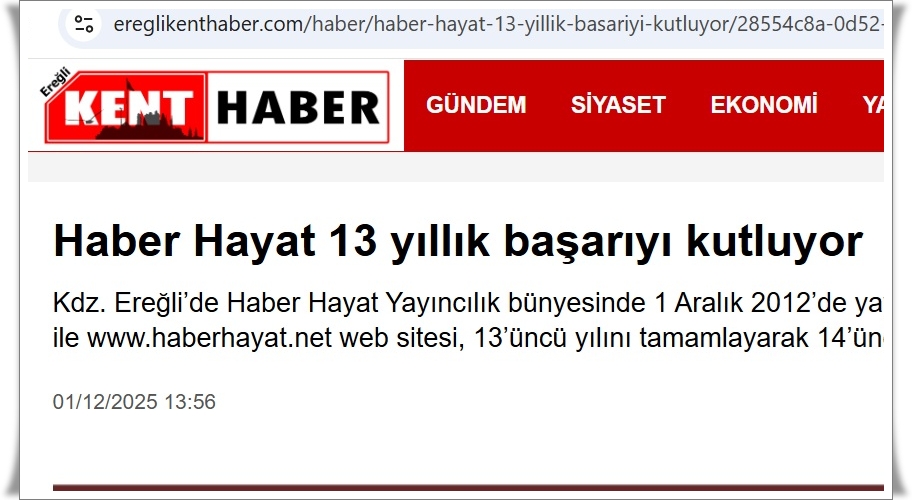 Kdz. Ereğli’de “Batı Karadeniz Ekonomi Politika Kültür Forumu” vizyonu ve “aydınlık bir dünya aydınlık bir hayat” misyonu ile yayınlarını sürdüren Haber Hayat Yayıncılık 13.’üncü yayın yılını tamamlayarak 14.ncü yayın yılına adım attı.