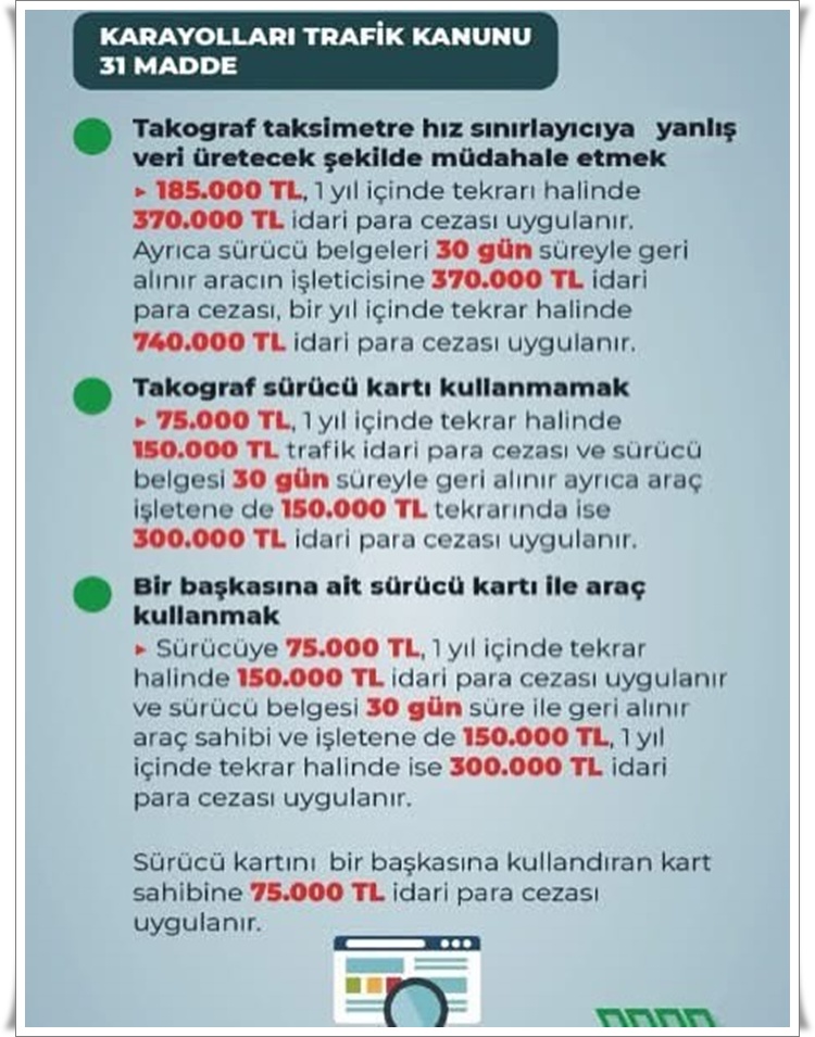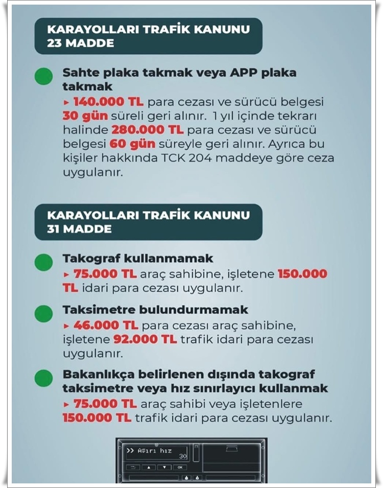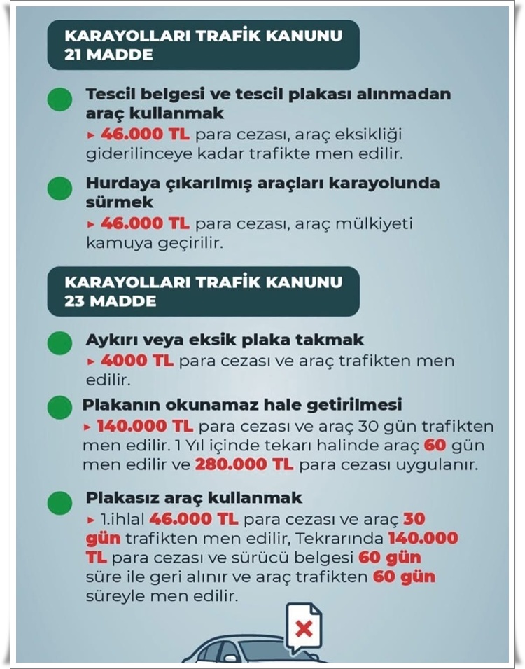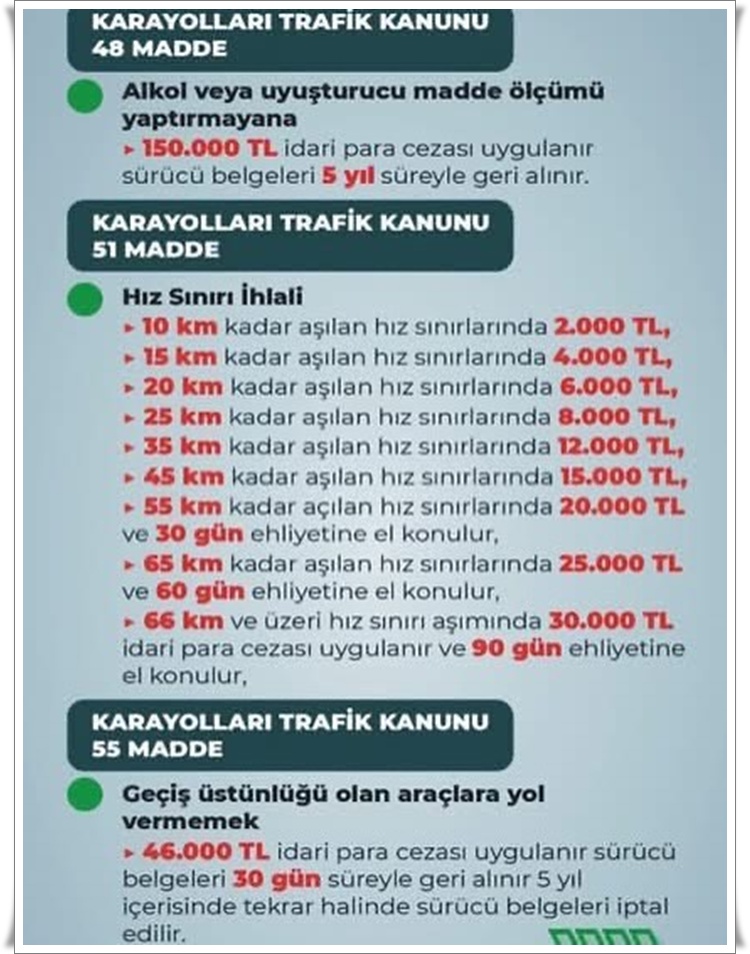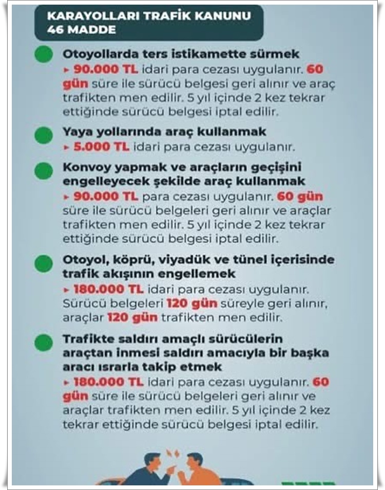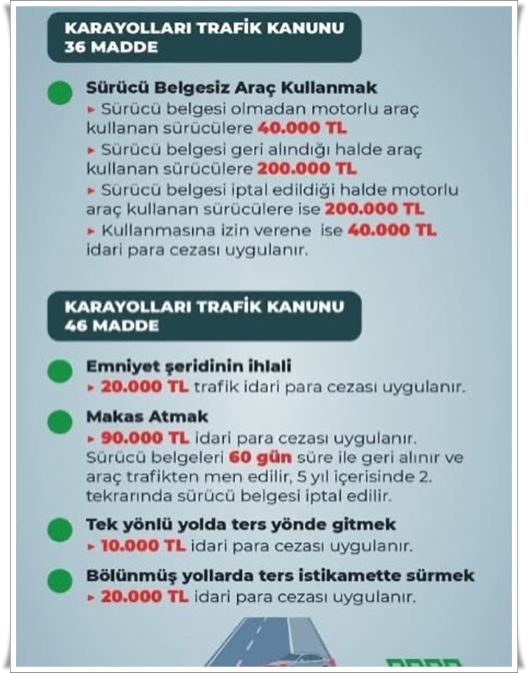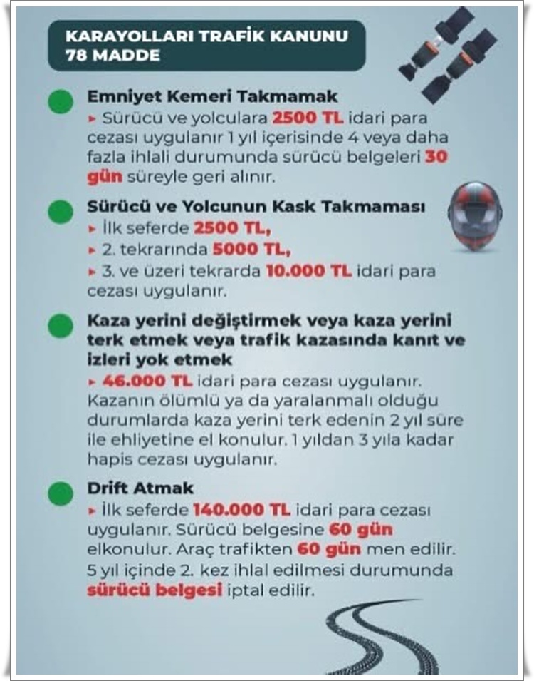 • Zonguldak İl Emniyet Müdürlüğü, 2918 sayılı Karayolları Trafik Kanunu’nda yapılan değişiklikler doğrultusunda trafik ihlalleri ve güncellenen ceza tutarlarına ilişkin bilgilendirme yaptı.