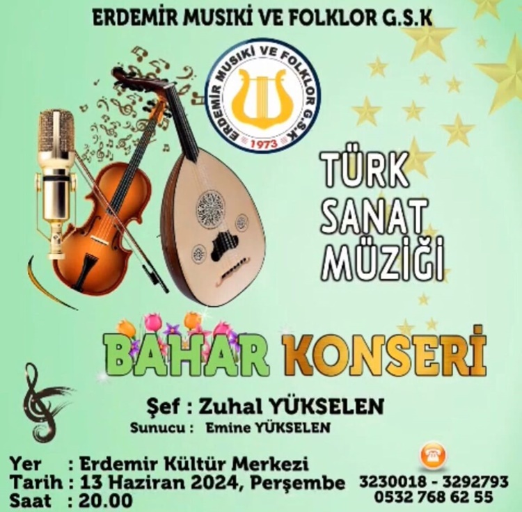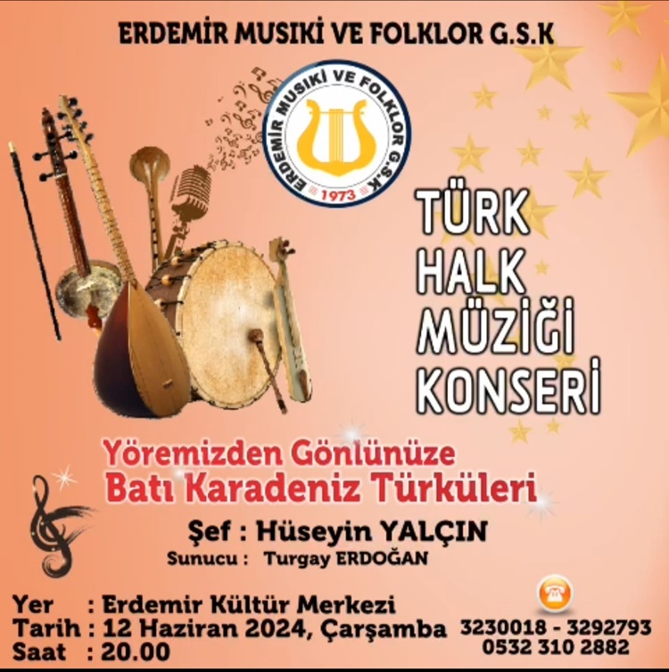 İlk konser, 12 Haziran 2024 Çarşamba günü Erdemir Kültür merkezinde düzenlenecek. “Yöremizden Gönlümüze Batı Karadeniz Türküleri” Türk Halk Müziği Konserini Şef Hüseyin Yalçın yönetecek, sunumları ise Turgay Erdoğan yapacak.