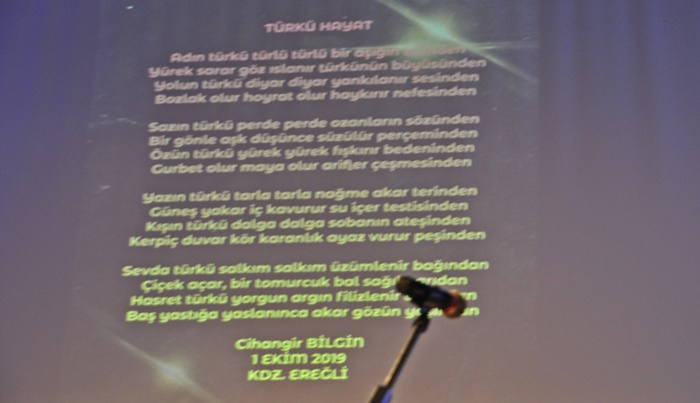Türkülerle devam eden konser sonlarına doğru Cihangir Bilgin kısa bir konuşma yaparak Kdz. Ereğli Kaymakamı İsmail Çorumluoğlu ve Belediye Başkanı Halil Posbıyık’ın davetli olmalarına rağmen katılmamalarına üzüldüğünü söyledi. Bilgin ayrıca, konserde emeği geçenlere tek tek teşekkür ettikten sonra Erdemir’e de sanat ve kültüre duyarlılığı nedeni ile özel olarak teşekkür edip, “önceki yıllarda alamadık ama bu sene salonu bize yıl boyunca tahsis ettiler. Ticari olmayan sanat-kültürel faaliyetlerine tahsis etmeye devam edeceklerini söylediler.” Dedi. Konserde Kafkas türküsü söyleyen sanatçıya salondan zarif dansı ile eşlik eden bayan seyirci büyük alkış aldı.