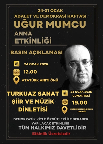 33 yıl önce suikast sonucu katledilen aydın insan Mumcu’yu anma programı, aynı gün akşam saatlerinde kültür ve sanatla devam edecek. Saat 19.00’da Erdemir Mühendisler Derneği’nde düzenlenecek “Turkuaz Sanat Şiir ve Müzik Dinletisi” ile Uğur Mumcu’nun düşünsel mirası sanat aracılığıyla yaşatılacak.