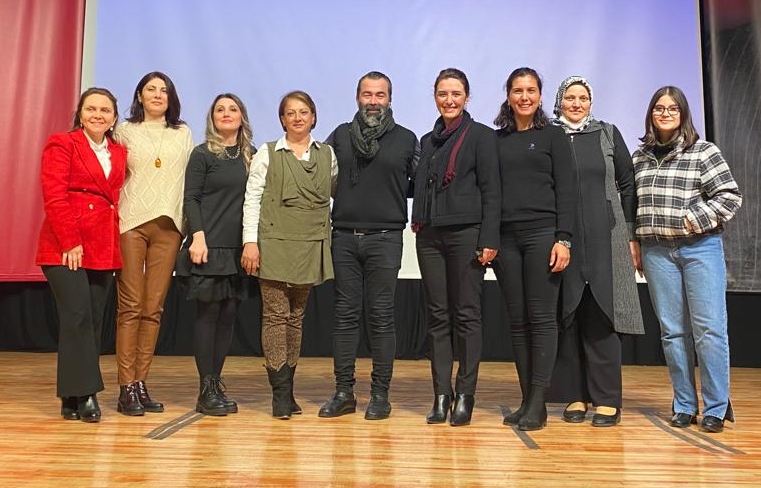 Konuşmaların ardından protokol, davetliler ve öğrenciler sanatçıyı kutlayarak sahnede hatıra fotoğrafı çektirdiler.