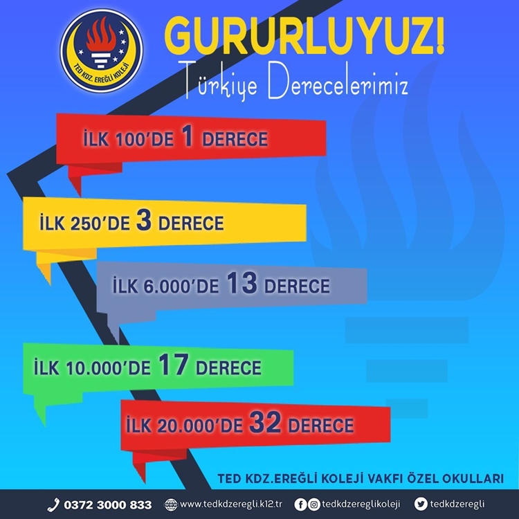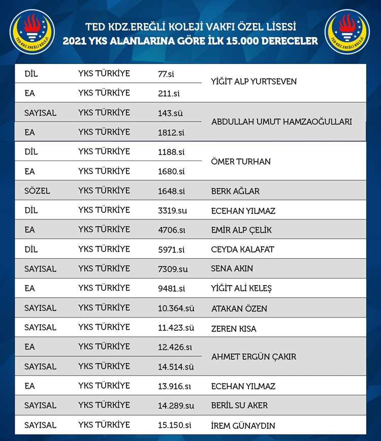 TED Kdz. Ereğli Koleji Vakfı Özel Lisesi öğrencileri, 2021 Yüksek Öğretim Kurumları Sınavı’nda Sayısal, Eşit Ağırlık, Sözel ve Dil alanlarında il birinciliğine imza attı.