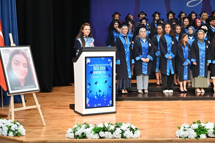 Mezun öğrencilerin tören alanına gelmesi, saygı duruşu ve İstiklal Marşı’nın okunmasıyla başlayan törende, 2023-2024 Akademik Yılı fakülte birincisi Sosyal Hizmetler Bölümü öğrencisi Betül Bilgiç, mezunlar adına konuşma yaptı. Törenin açılışında konuşan Sağlık Bilimleri Fakültesi Dekanı Prof. Dr. Sibel Koçak, mezunlardan mesleklerine ve insanlığa bağlılıklarını sürdürerek kendi bilgi ve becerilerini her daim geliştirmelerini ve kutsal bir meslek icra ettiklerinin bilincinde her zaman sabır ve şefkatle hareket etmeleri gerektiğini belirtti. Koçak, tüm mezunların ailelerine ve fakülte akademisyenlerine vermiş oldukları emeklerden dolayı teşekkürlerini sunarken mezunları da tebrik etti. Koçak, göreve geldiği günden beri başarı çıtasını sürekli daha yukarı taşımaya çalışan ve bu doğrultuda her türlü imkânı sunmaya gayret eden ZBEÜ Rektörü Prof. Dr. İsmail Hakkı Özölçer’e teşekkürlerini sundu.