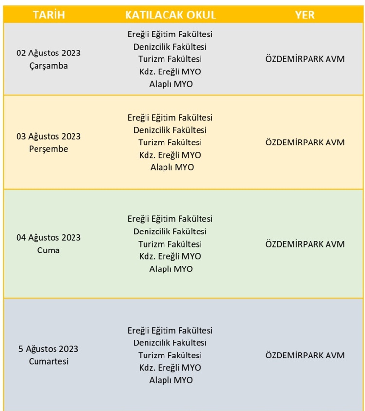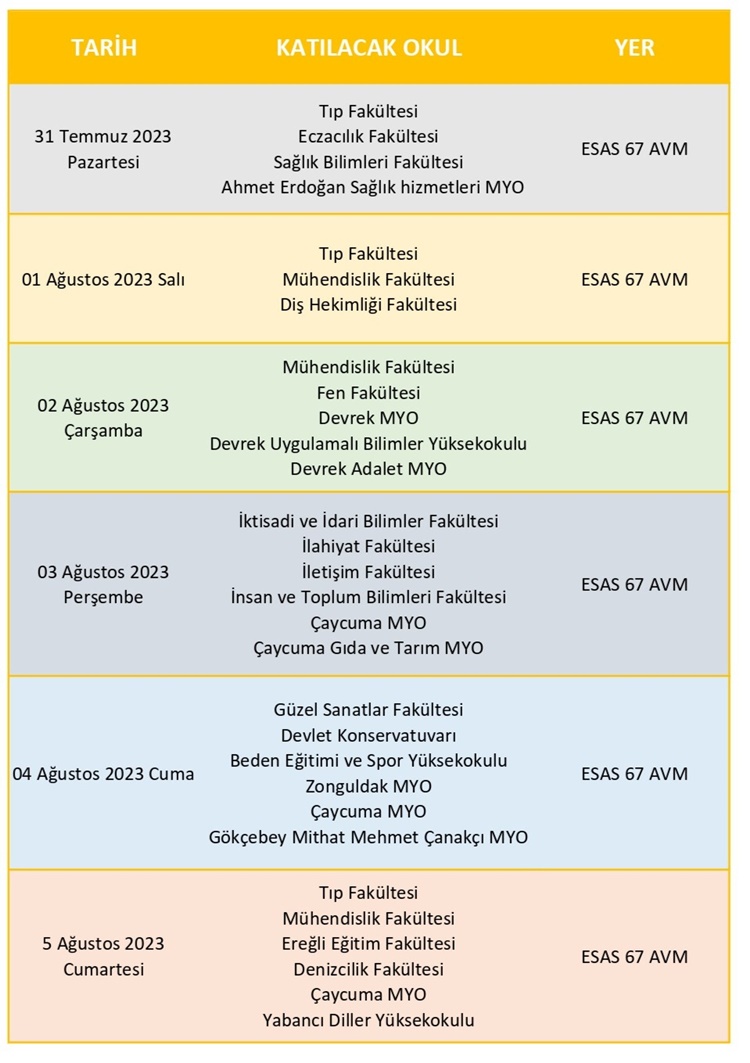 Bu amaçla Zonguldak Bülent Ecevit Üniversitesi tarafından, Zonguldak merkezde bulunan Esas 67 Burda AVM’de ve ayrıca Kdz. Ereğli’deki Özdemirpark AVM’de stantlar kurulacak. Kurulan stantlarda uzman tercih rehberleri, aday öğrencilere rehberlik ederek doğru tercih yapmalarına katkıda bulunacak.