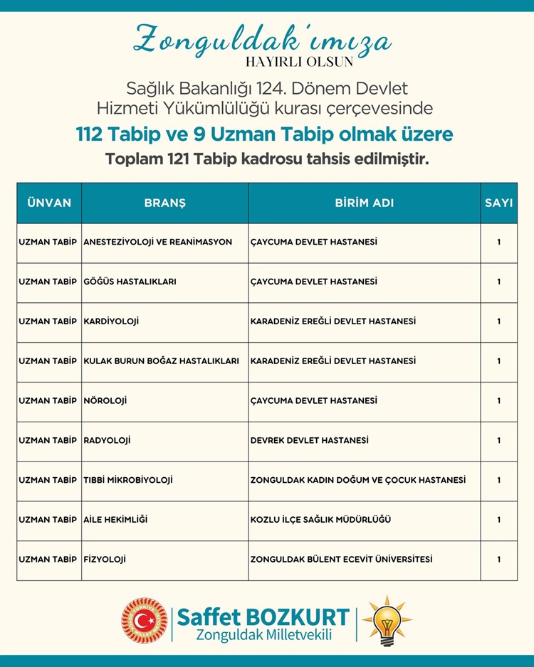 • Ak Parti Zonguldak Milletvekili Saffet Bozkurt, Zonguldak geneline 9’u uzman olmak üzere 121 hekim kadrosu tahsis edildiğini açıkladı.
