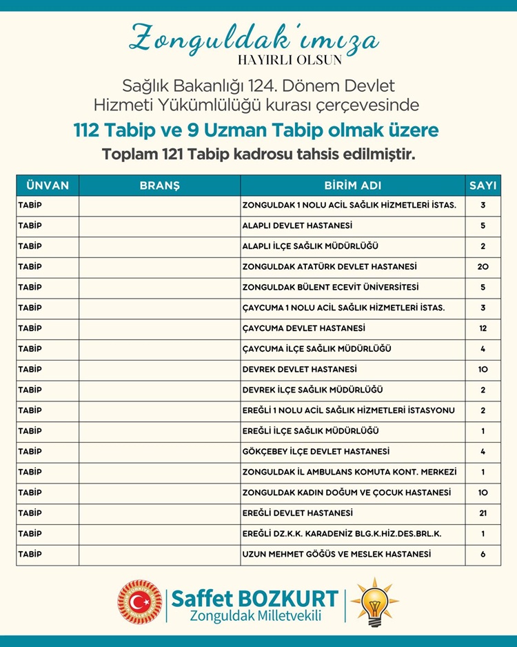 “Sağlık Bakanlığı’mız tarafından 124. Dönem “Devlet Hizmet Yükümlülüğü” (DHY) kapsamında, Zonguldak’ımıza 9 Uzman Tabip, 112 Tabip olmak üzere toplam 121 Tabip kadrosu tahsis edilmiştir.