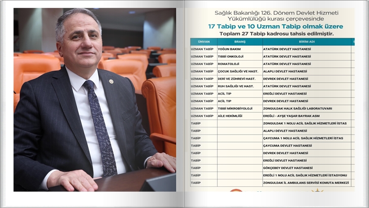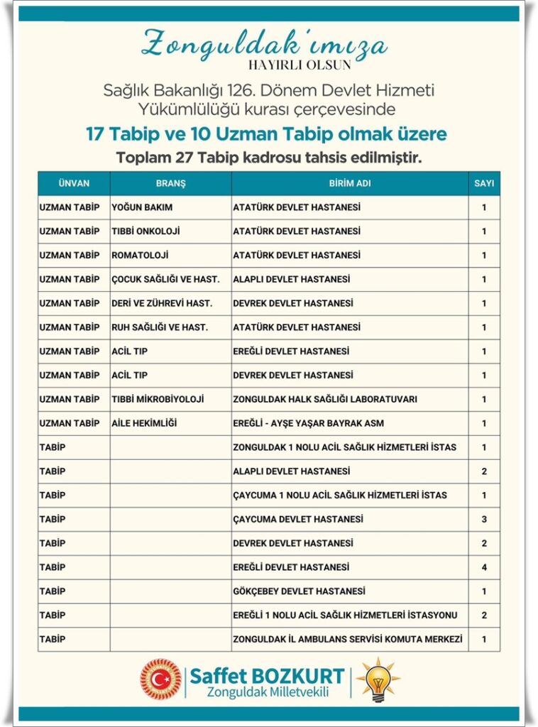 Ak Parti Zonguldak Milletvekili Saffet Bozkurt’un açıklamasına göre; çekline kura sonucunda Zonguldak Atatürk Devlet Hastanesi, Ereğli Devlet Hastanesi, Devrek Devlet Hastanesi, Alaplı Devlet Hastanesi, Çaycuma Devlet Hastanesi, Gökçebey Devlet Hastanesi ile birlikte acil sağlık hizmetleri istasyonları, aile sağlığı merkezi ve halk sağlığı laboratuvarlarına yeni hekim atamaları yapıldı.